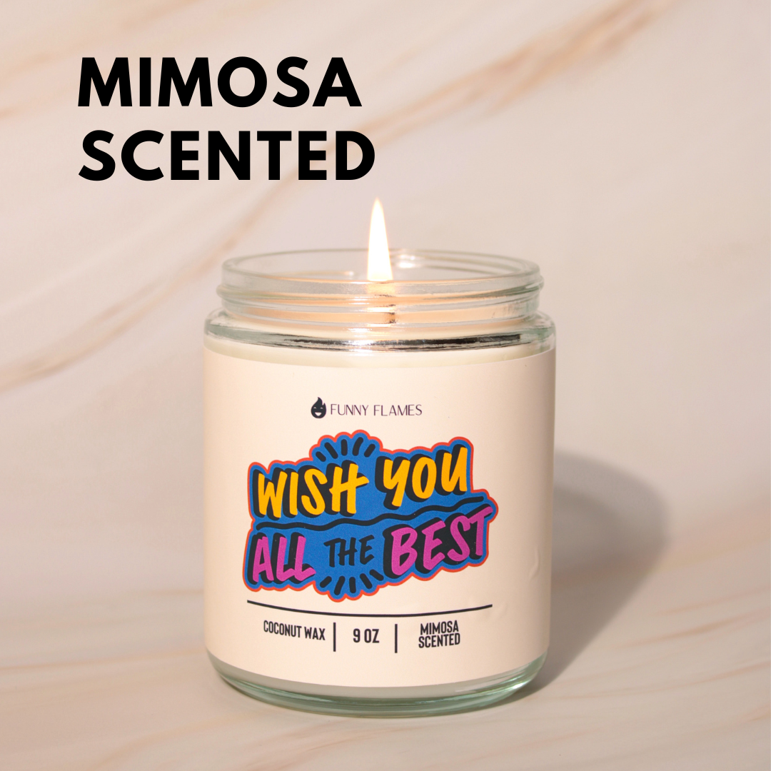 'Wish You All The Best,' the candle that encapsulates a heartfelt wish for success and happiness. With its uplifting mimosa scent, this candle fills the air with the invigorating and effervescent fragrance of citrusy oranges and sparkling champagne. Light up this candle to set the tone for new beginnings, celebrations, or to wish someone well on their journey ahead. The name itself serves as a reminder of good intentions and positive vibes. 'Wish You All The Best' is the perfect gift to send warm wishes and encouragement to friends, family, or colleagues, making every moment feel like a toast to a brighter future.Scent: Mimosa